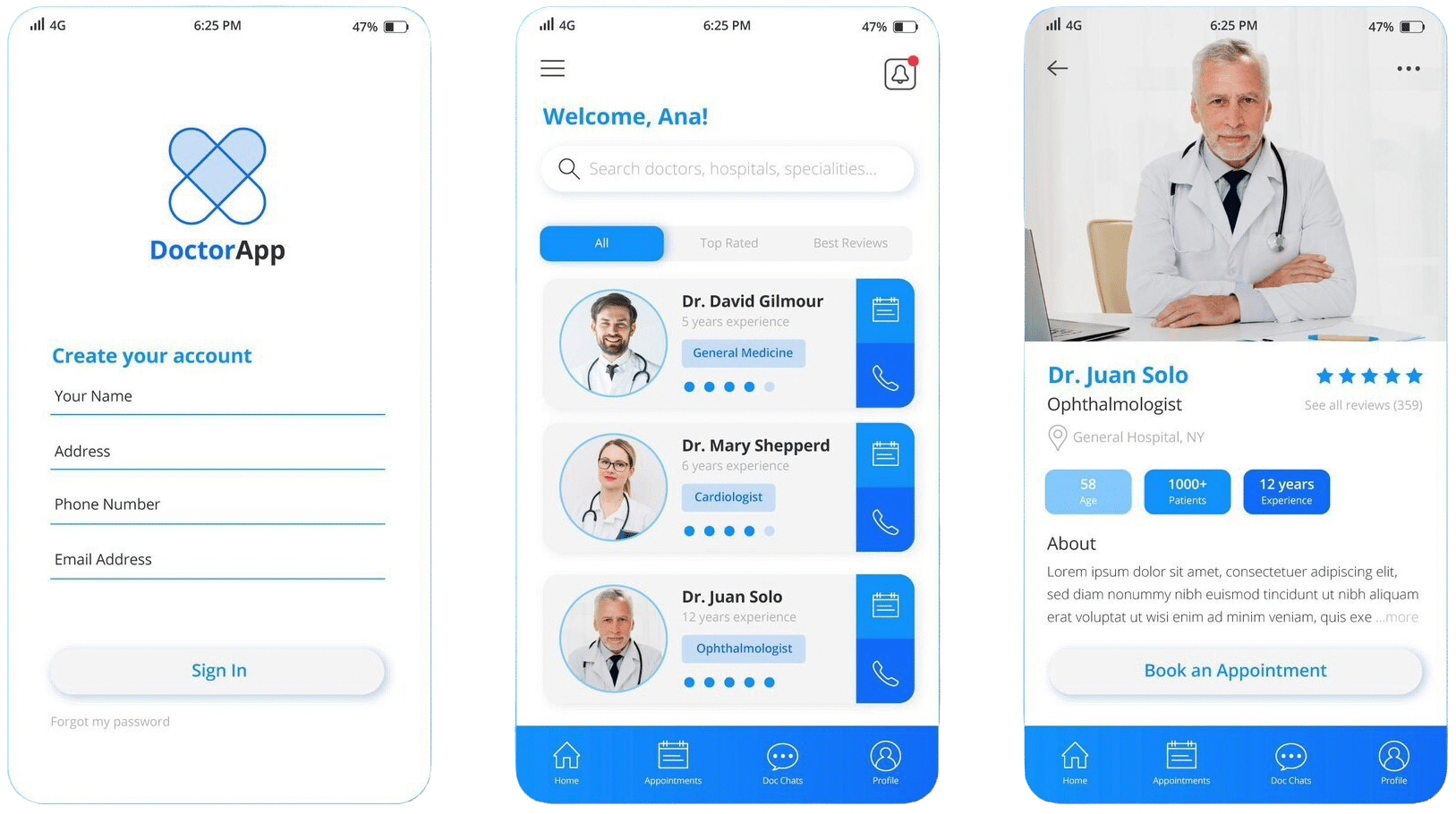 Show doctors’ details, specialties, and reviews.Reviewing Profiles